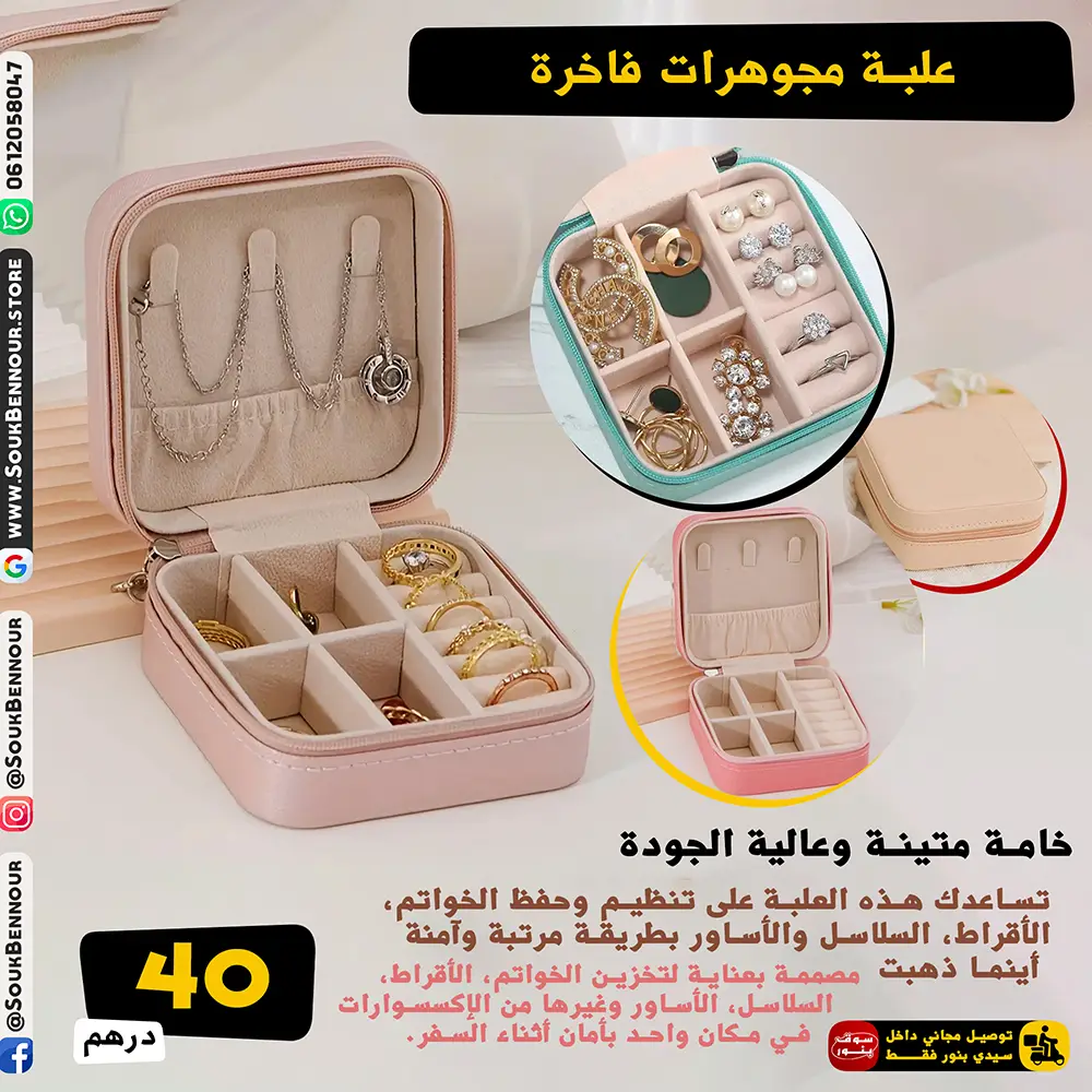 تساعدك هذه العلبة على تنظيم وحفظ الخواتم، الأقراط، السلاسل والأساور بطريقة مرتبة وآمنة أينما ذهبتِ.